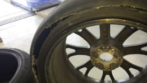 こちらのタイヤ、裏側がなんと避けてしまっています・・・よく見ると「ネジ」を踏んでしまっていたようです。表面からでは状況が分かりませんでした、19インチ偏平率35ともなると多少の空気圧低下がわかりにくく、気付いた時にはもう既に手遅れだった・・・と言う事になりやすいんです。