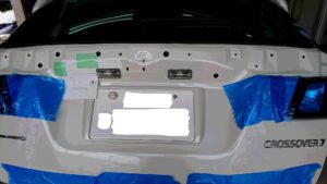 全ての用品が純正装着品のお取り付けでしたが、ご存知ですか?バックカメラ用のサービスホールが付いていないんですよ!その為、取付概要書には型紙が入っており「その位置に穴を開けて下さい」と書いてあるだけなんです・・・。新車の「リアガーニッシュ」の取り外し、型紙合わせの穴明け加工・・・新車なんです、精神的にやられます・・・この作業後、オーナーさんへ納車になる大事なお車なので、どの工程をとっても普段の作業以上に時間が掛かってしまいました。せめて取付は大体一緒の位置に取り付けるのだから「サービスホール」位、有ってもいいのになあ~と思います。